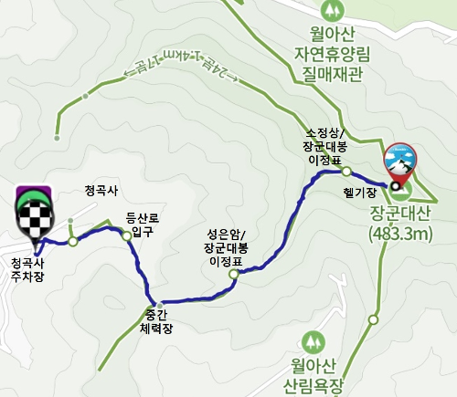 청곡사 주차장 ▶ 등산로 입구 ▶ 중간 체육장 ▶성은암/장군대봉 이정표 ▶소정상/장군대봉 이정표 ▶헬기장 ▶ 장군대봉